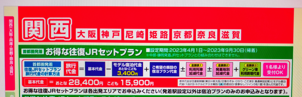 1、安くならないですよ。 画像のページより前に宿泊先候補のページがありますよね。 この旅行は、 基本の宿泊先料金が3400円分含まれた往復交通費となっていて、 それがおとな28,400円です。 赤い風船のデジタルカタログを見てると、+0円の宿がないので、 28,400円に泊まりたい宿の泊まりたい時期の所の値段を足して、そこから3400円を引いた金額旅行代となると思います。 例えば、Aの時期に行くとして、その欄の人数の所の金額を見る。 それが1万円だったとしたら、28400⁺10000-3400=35000円/1人になる。という事だと思います。 新幹線往復チケットだけの販売をしないと書いてあるので、こういう感じになるのでは? 全パンフレットを見ると3400円で泊まれる宿があるのかもしれません。 2、1に書いた通り、そのページより前の宿泊先候補の所の事を言っていると思います。 そこの行きたい時期と人数で金額がわかるようになっていますよ。 お料理を豪勢にするなどのOPで更に良いご旅行にすることができますという意味だと思います。